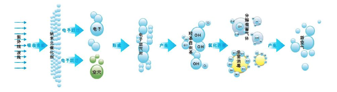 凈化原理:納米光催化劑在uvc照射下受激發(fā)生成“電子—空穴”對(一種高能粒子),這種電子—空穴對和周圍的水、氧氣發(fā)生作用后,就具有較強的氧化—還原能力,能將空氣中的VOC分解成水和二氧化碳等無害物質(zhì) , 并破壞細菌的細胞璧殺滅細菌且分解其絲網(wǎng)菌體 , 從而達到消除空氣污染的目的。適當波長的紫外線能夠破壞微生物機體細胞中的DNA(脫氧核糖核酸)或RNA(核糖核酸)的分子結(jié)構(gòu),造成生長性細胞死亡和(或)再生性細胞死亡,達到殺菌消毒的效果。